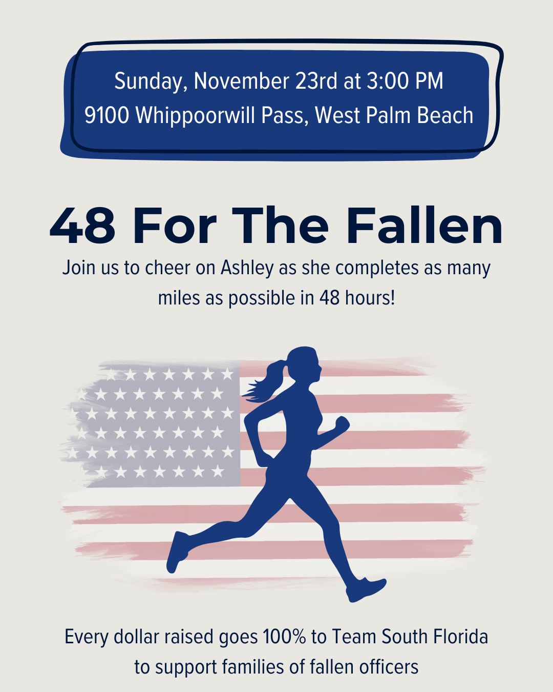A veteran South Florida law enforcement officer, runner, and jiu-jitsu trainer, Detective Ashley, is taking on a 48-hour challenge for a cause far greater than herself. She will run as many miles as her body and spirit allow – dedicating every step to honor the fallen heroes of law enforcement.